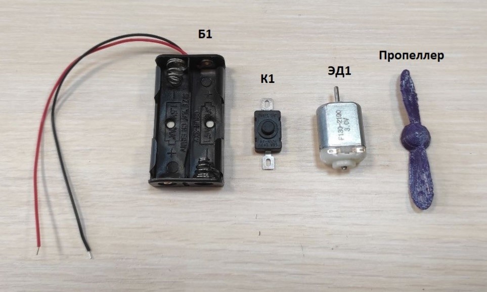 6 После установки батареек, включение и выключение мотора ЭД1 производится нажатием кнопки К1. В случае неправильного вращения пропеллера необходимо поменять полярность питания на электродвигателе ЭД1.