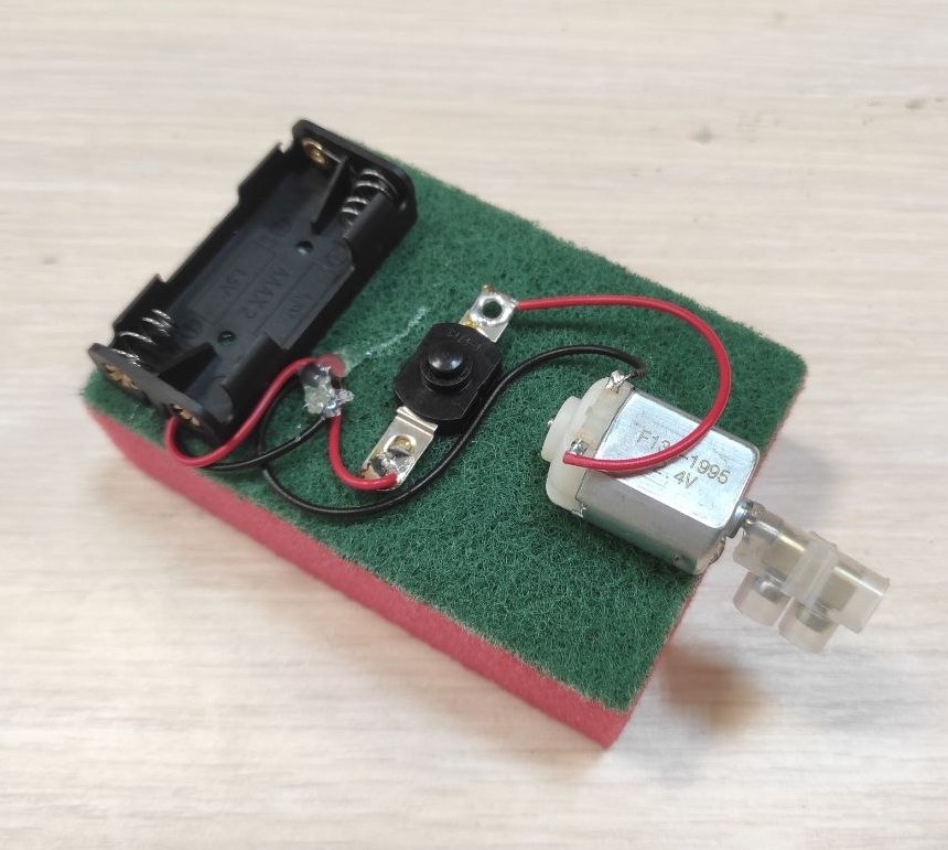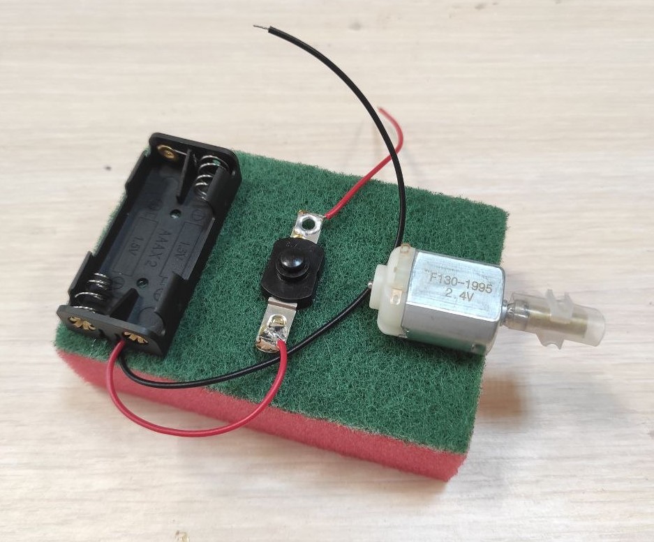 Комплектация: батарейный отсек 2хАА, кнопка, электромотор, клеммник, губка для мытья посуды.